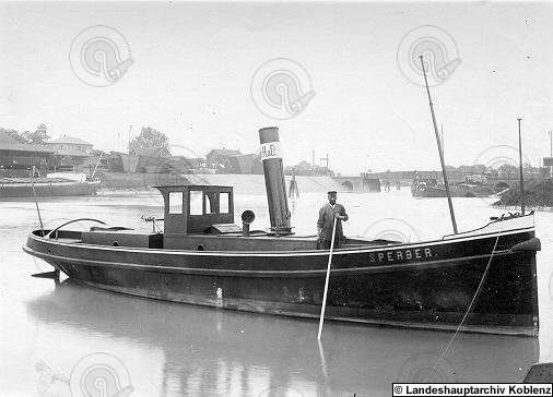 Onderstaande foto gevonden op internet, boot heet Sperber en is genomen op de Lahne een zijrivier van de Rijn. Boot is een stoomboot, foto gemaakt rond 1900. Of er een Sperbertje op de foto zelf staat weet ik niet.